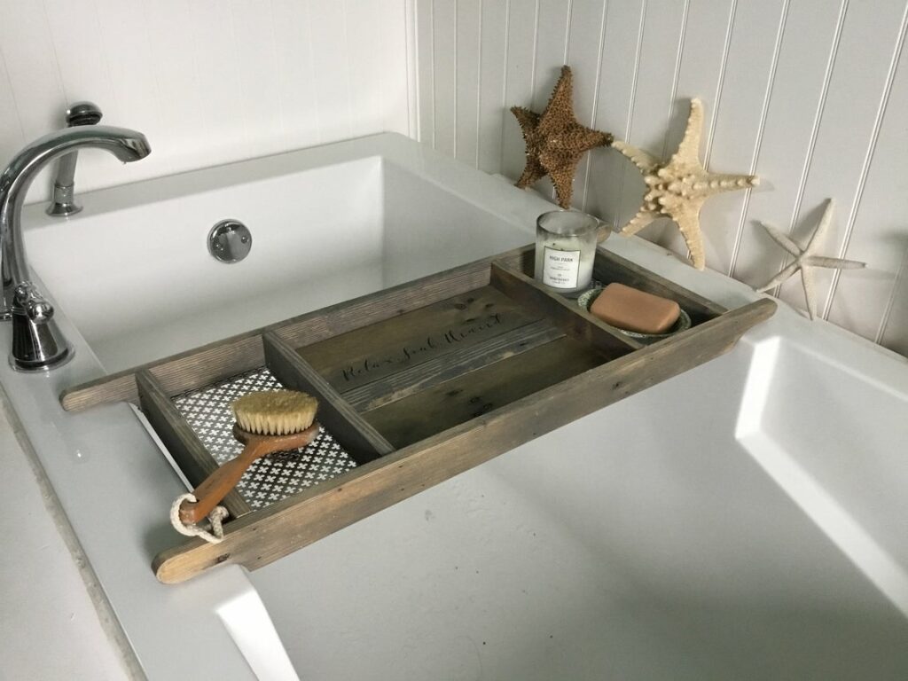 Rustic Style 12 inch wide Bathtub Tray , Barn Wood Gray , Personalized Quote, Recycled Wood, Custom Made to Order and Fit Sizes: 150 × 150 / 300 × 225 / 768 × 576 / 1,024 × 768 / 1,140 × 855